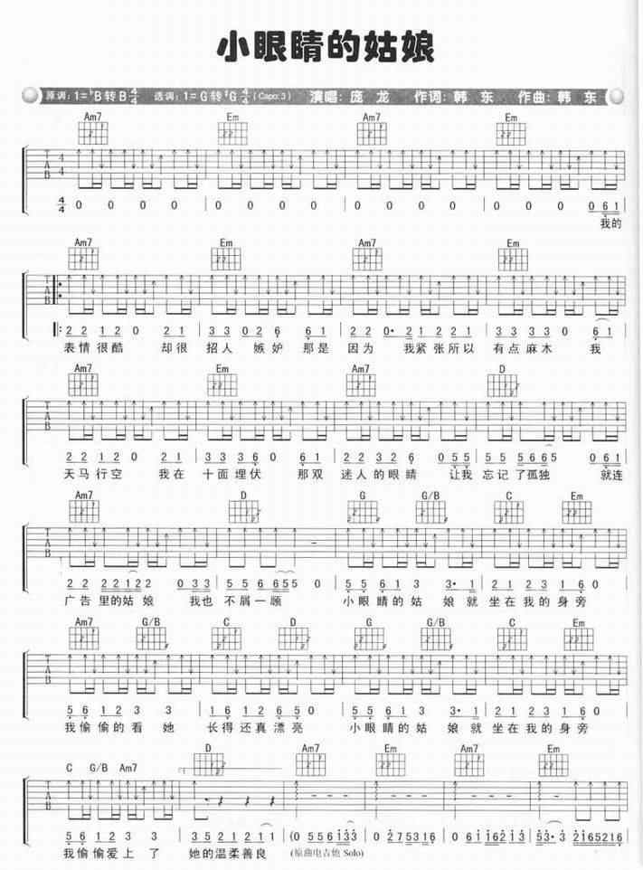 小眼睛的姑娘-庞龙(吉他谱 吉他曲谱 吉他六线谱 吉他歌谱 吉它谱 影视吉他谱)