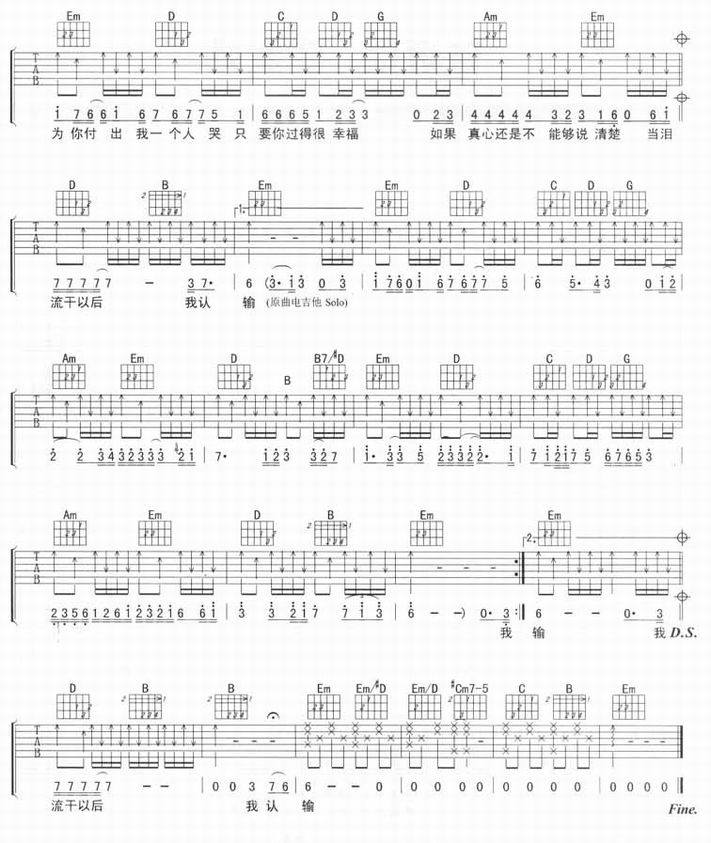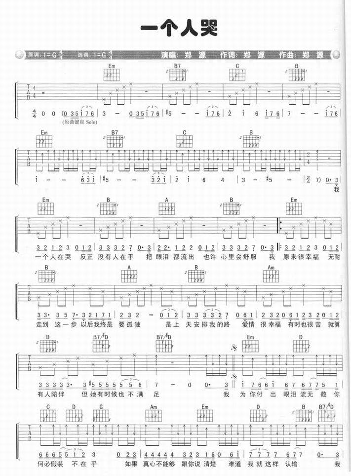 一个人哭-郑源(吉他谱 吉他曲谱 吉他六线谱 吉他歌谱 吉它谱 影视吉他谱)
