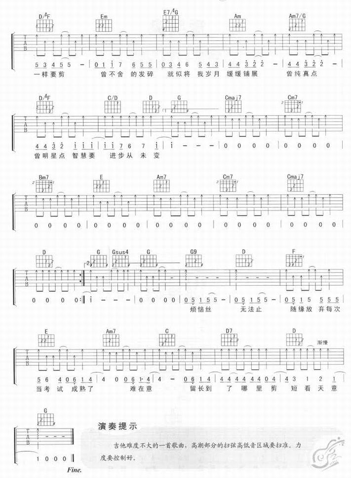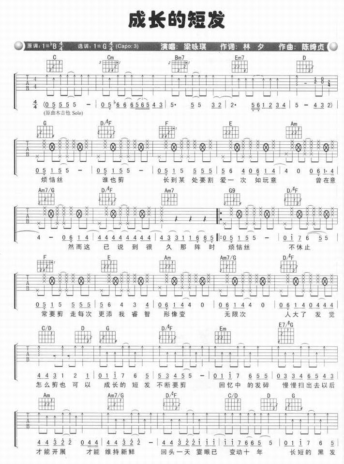 成长的短发-梁咏琪(吉他谱 吉他曲谱 吉他六线谱 吉他歌谱 吉它谱 影视吉他谱)