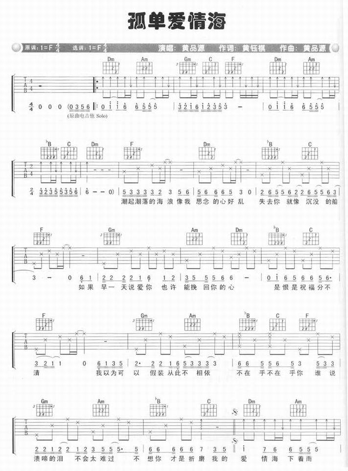 孤单爱情海-黄品源(吉他谱 吉他曲谱 吉他六线谱 吉他歌谱 吉它谱 影视吉他谱)