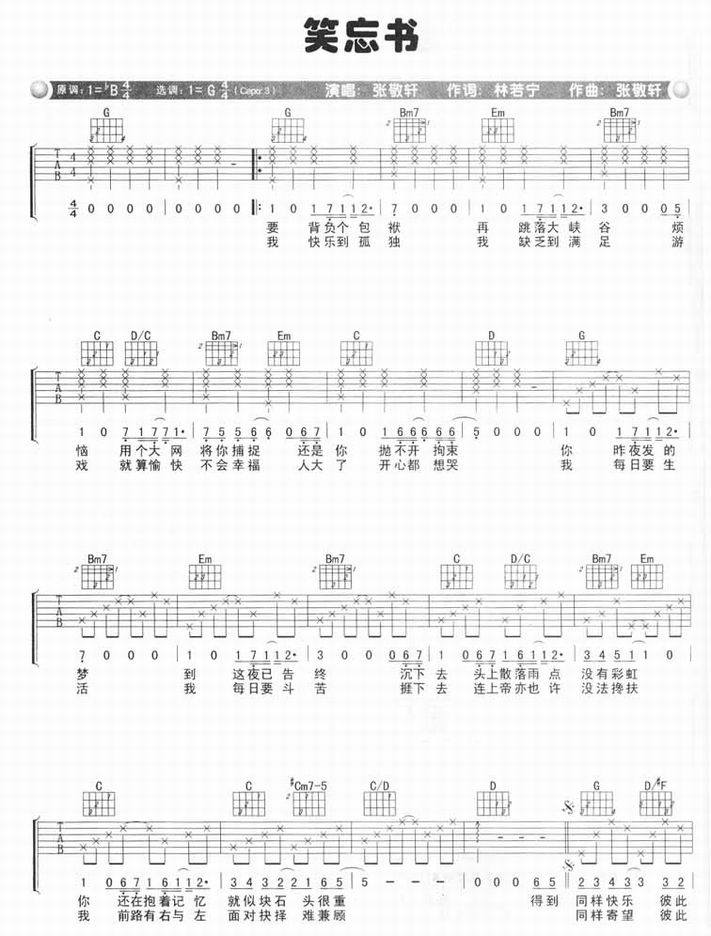 笑忘书-张敬轩(吉他谱 吉他曲谱 吉他六线谱 吉他歌谱 吉它谱 影视吉他谱)