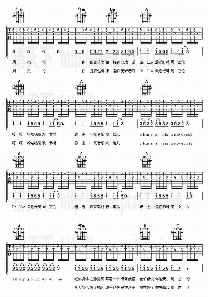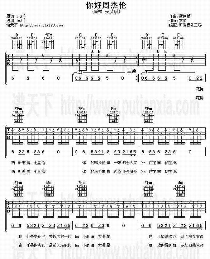 你好周杰伦-安又琪(吉他谱 吉他曲谱 吉他六线谱 吉他歌谱 吉它谱 影视吉他谱)