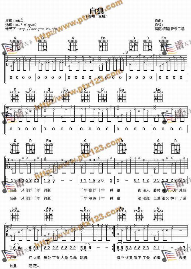 白狐-陈瑞(吉他谱 吉他曲谱 吉他六线谱 吉他歌谱 吉它谱 影视吉他谱)