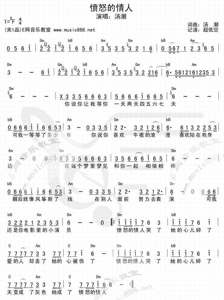 愤怒的情人-汤潮(简谱 歌谱 歌曲简谱 合唱简谱 影视简谱)