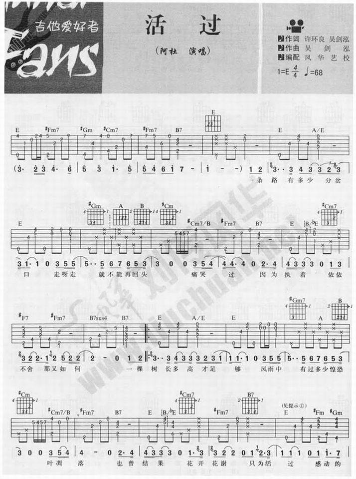 活过-阿杜(吉他谱 吉他曲谱 吉他六线谱 吉他歌谱 吉它谱 影视吉他谱)