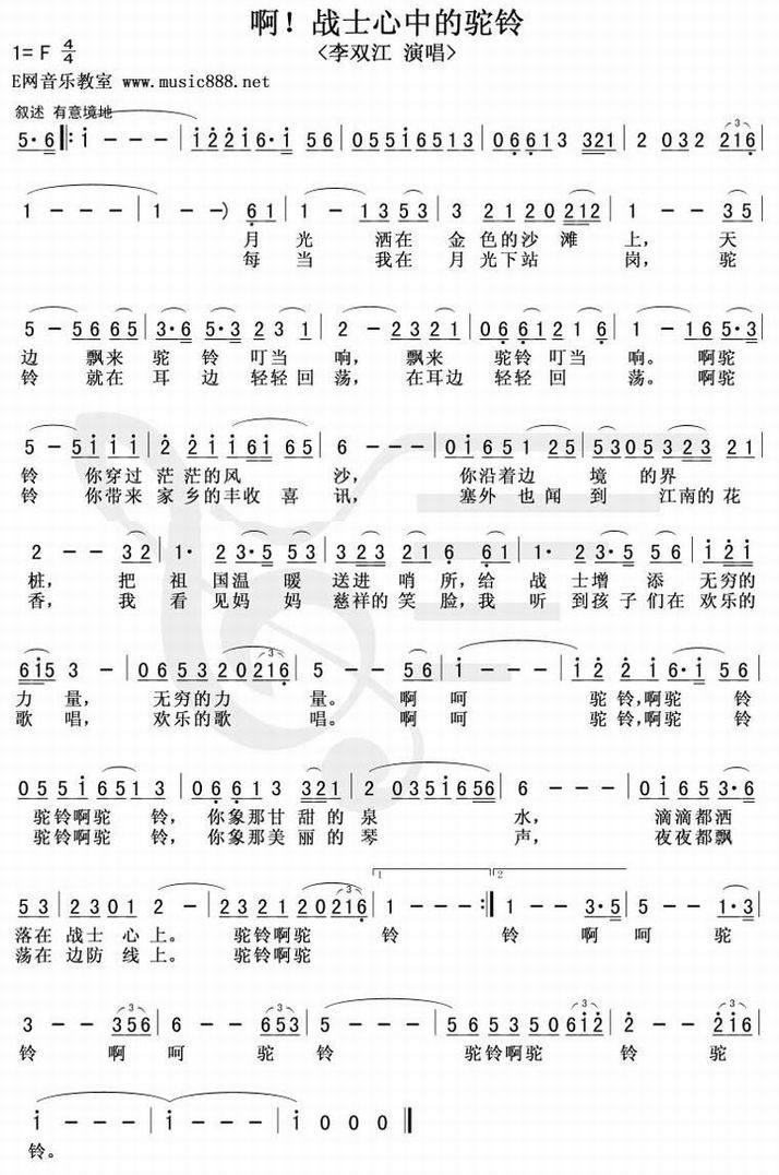 战士心中的驼铃-李双江(简谱 歌谱 歌曲简谱 合唱简谱 影视简谱)