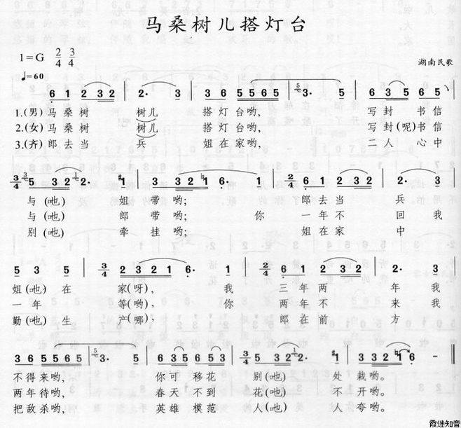 1、马桑树树儿搭灯台哟,我写封(的)书信与(也)姐带哟,朗去当兵姐(也)在家呀,我三五两年(个儿)不得来哟你(个儿)移花别(也)处栽哟。