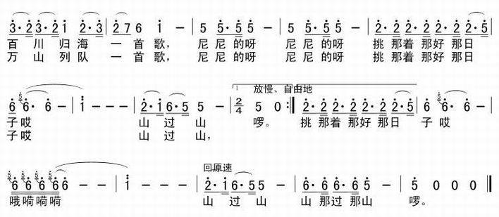 哎,东海牵着西山走罗,红日星灯永作伴。尼尼的呀尼尼的呀,百川归流一首歌,尼尼的呀尼尼的呀,挑着好日子啊,山过山罗。