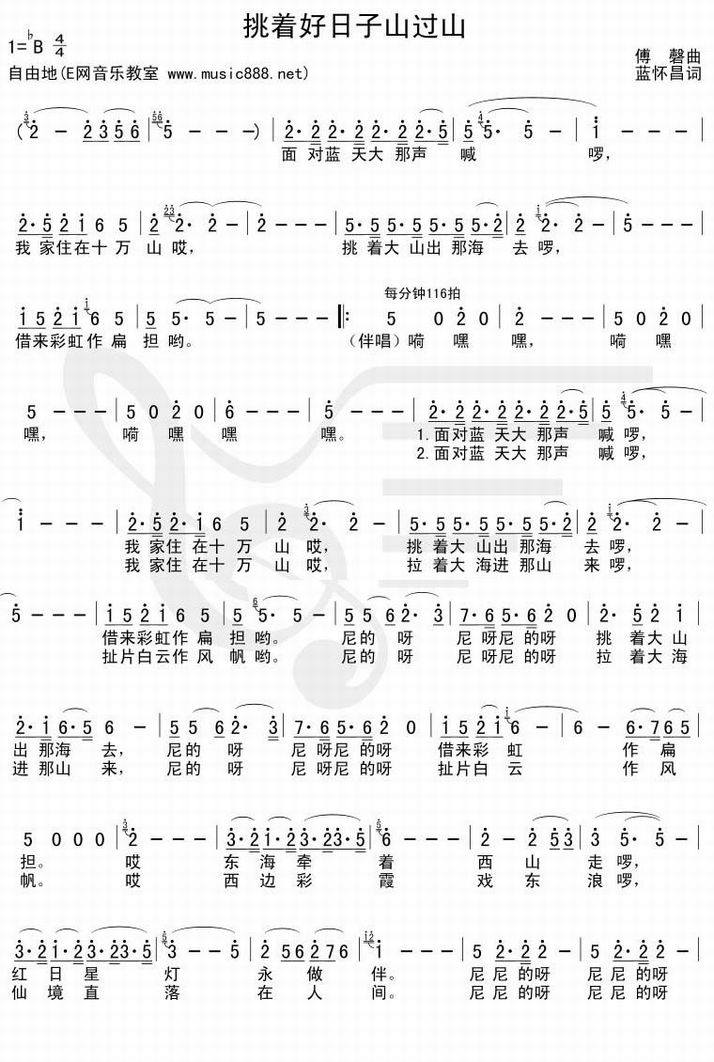挑着好日子山过山-吴碧霞(简谱 歌谱 歌曲简谱 合唱简谱 民歌简谱 影视简谱)