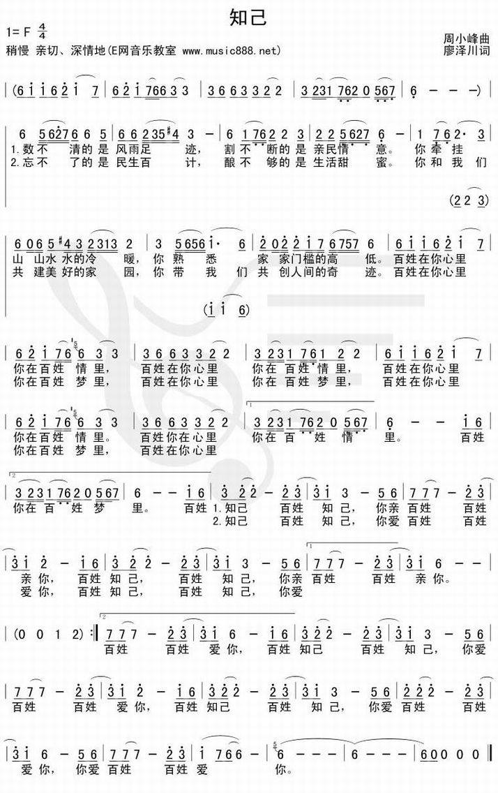 知己-吴碧霞(简谱 歌谱 歌曲简谱 合唱简谱 民歌简谱 影视简谱)