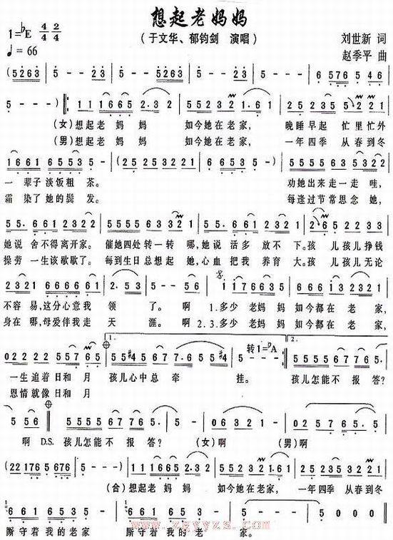 想起老妈妈-于文华(简谱 歌谱 歌曲简谱 合唱简谱 民歌简谱 影视简谱)