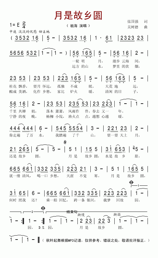 >> 月是故乡圆-祖海(简谱)