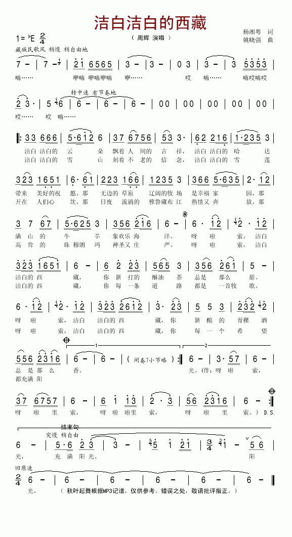 洁白洁白的西藏-周辉(简谱 歌谱 歌曲简谱 合唱简谱 民歌简谱 影视简谱)