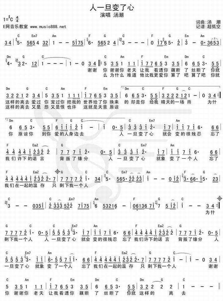 人一旦变了心-汤潮(简谱 歌谱 歌曲简谱 合唱简谱 民歌简谱 影视简谱)
