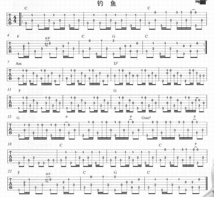 钓鱼(吉它曲谱 指弹独奏 吉他六线谱 吉他曲谱 吉它谱 影视吉他谱)