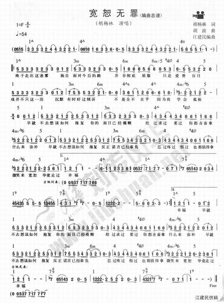 宽恕无罪-胡杨林(简谱 歌谱 歌曲简谱 合唱简谱 民歌简谱 影视简谱)