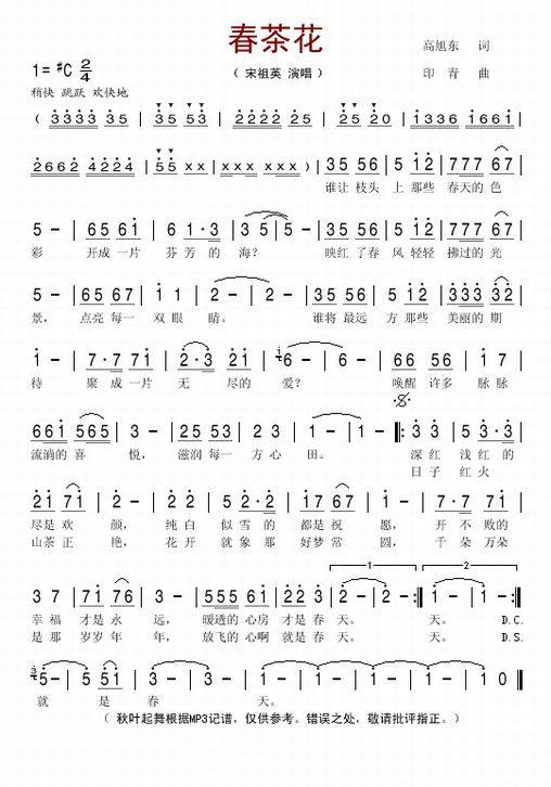 春茶花-宋祖英(简谱 歌谱 歌曲简谱 合唱简谱 民歌简谱 影视简谱)