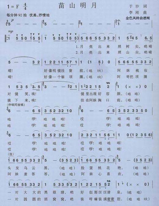 苗山明月-宋祖英(简谱 歌谱 歌曲简谱 合唱简谱 民歌简谱 影视简谱)