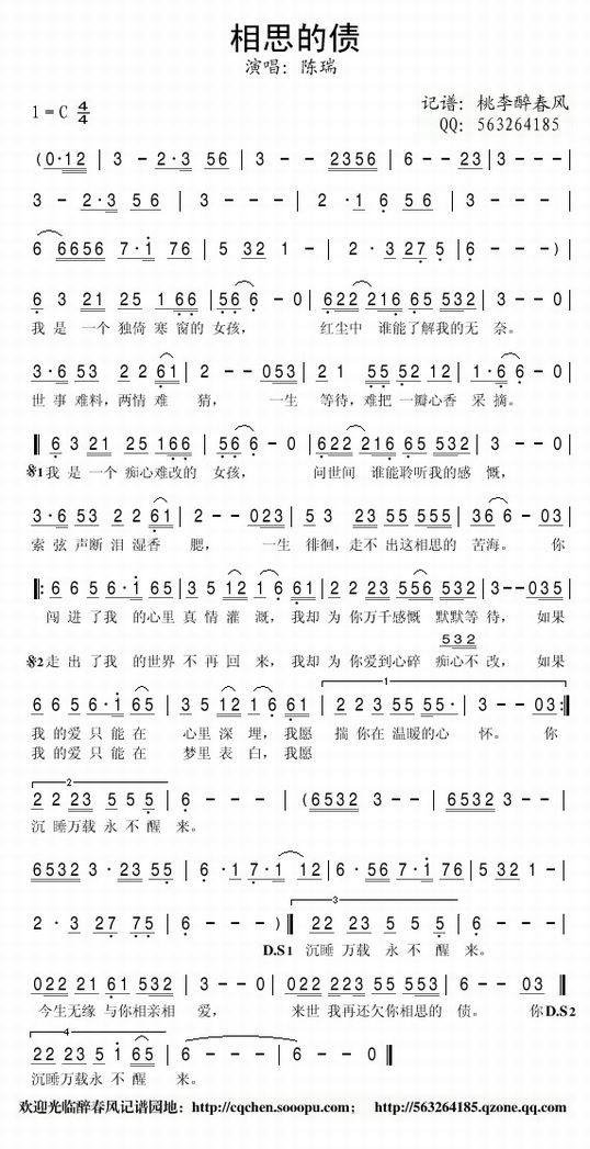 >> 相思的债—陈瑞(简谱)