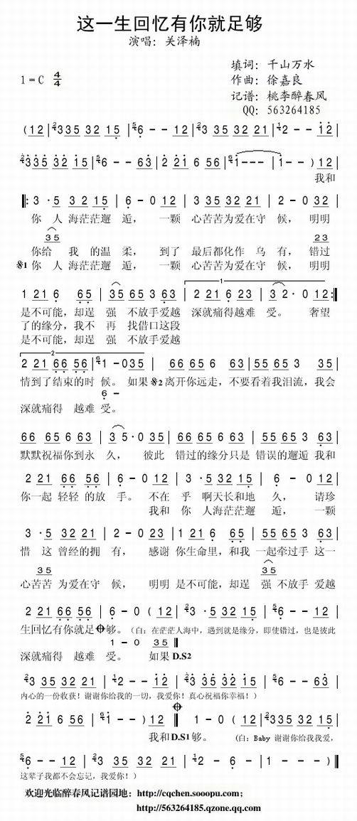 >> 这一生回忆有你就足够—关泽楠(简谱)