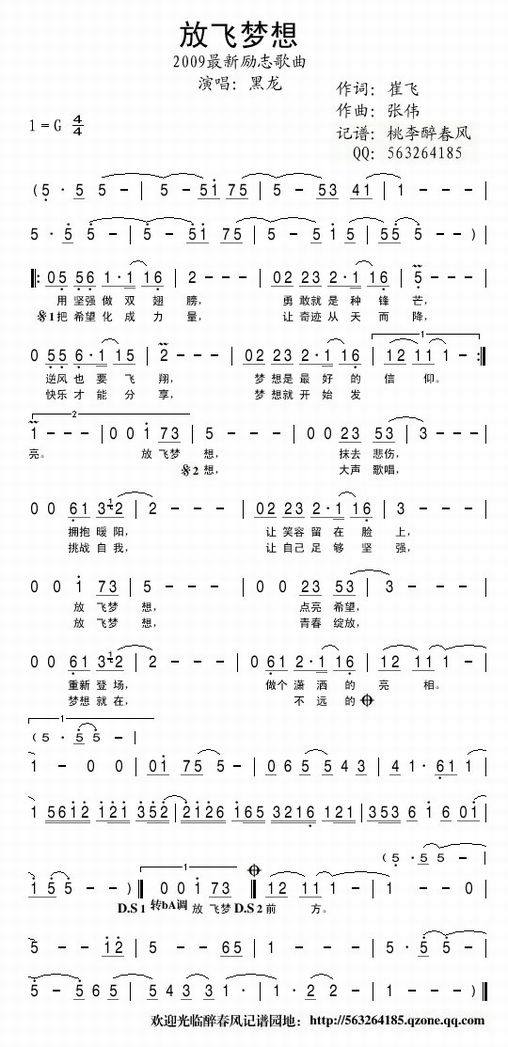 放飞梦想(2009最新励志歌曲)—黑龙(简谱 歌谱 歌曲简谱 合唱简谱 影视简谱)