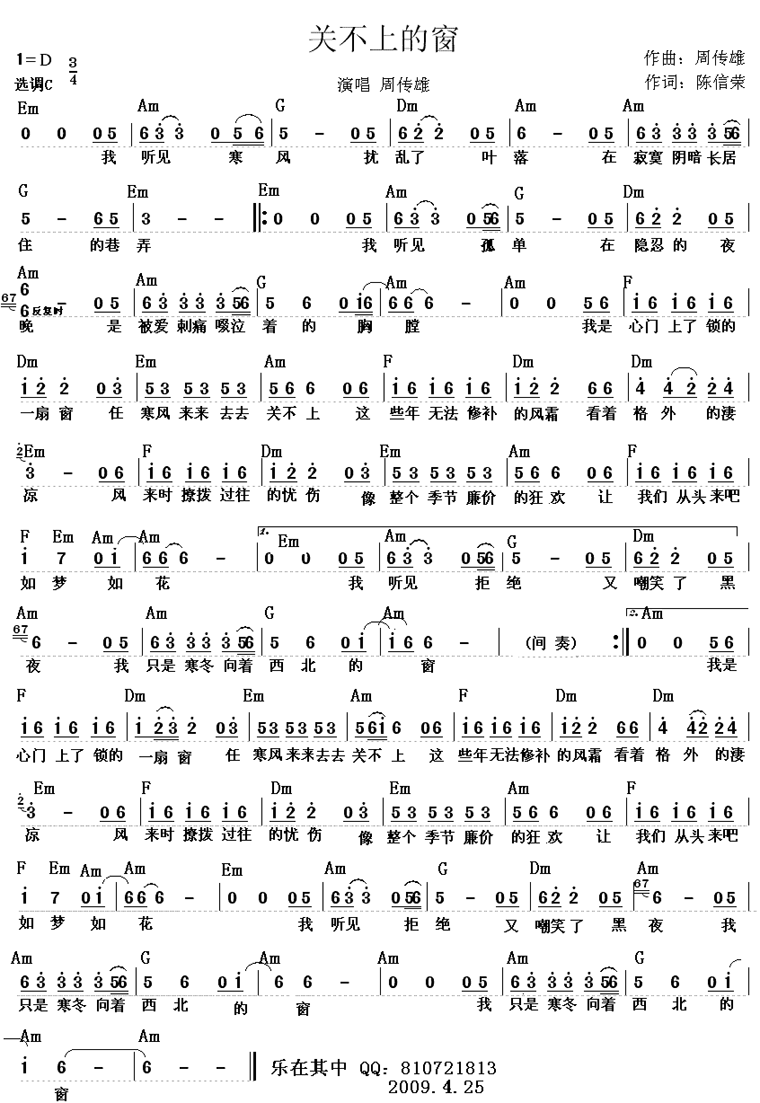 关不上的窗-周传雄(简谱 歌谱 歌曲简谱 合唱简谱 影视简谱)