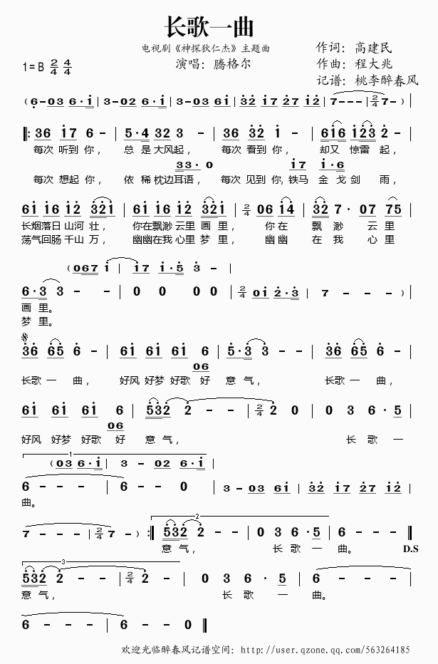 长歌一曲(《神探狄仁杰》主题曲)——腾格尔(简谱)