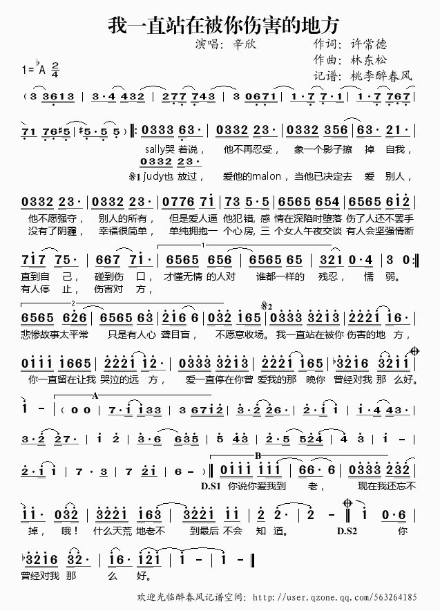 >> 我一直站在被你伤害的地方——辛欣(简谱)
