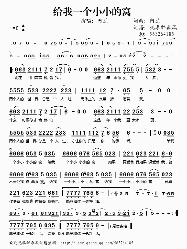 >> 给我一个小小的窝——阿兰(简谱)