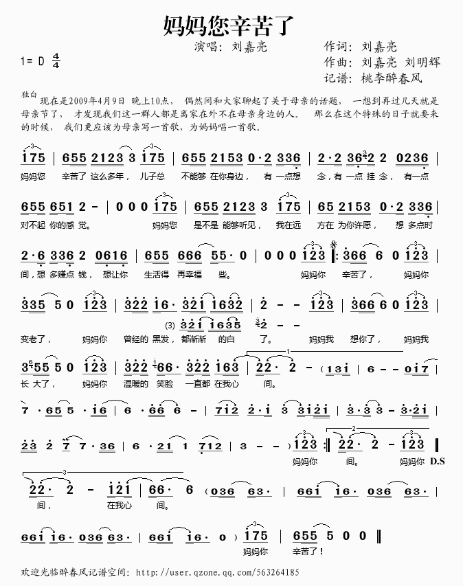 >> 妈妈您辛苦了——刘嘉亮(简谱)