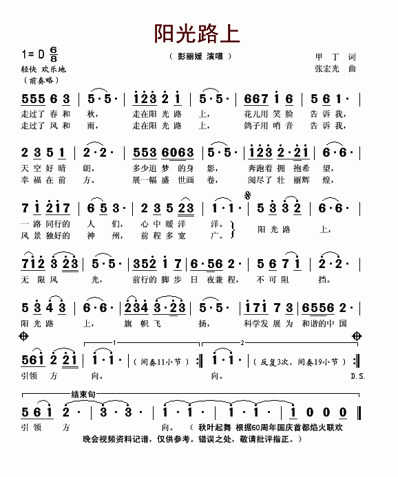 国庆60周年,首都焰火联欢晚会歌曲选。21时14分许,伴着悠扬的旋律,站在千人合唱队中心台上的歌唱家彭丽媛唱响了著名词曲作家甲丁、张宏光专为国庆创作的歌曲《阳光路上》,第四乐章《到处都有明媚阳光》开始了。