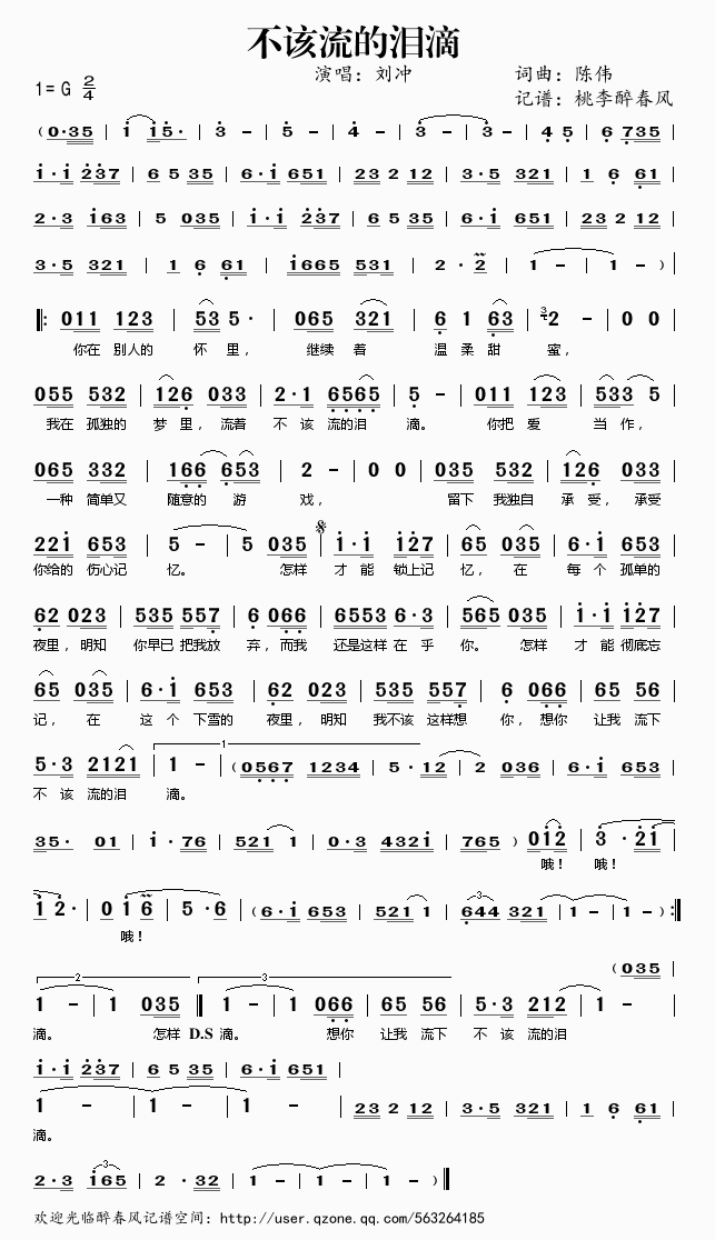 >> 不该流的泪滴(完整)——刘冲(简谱)