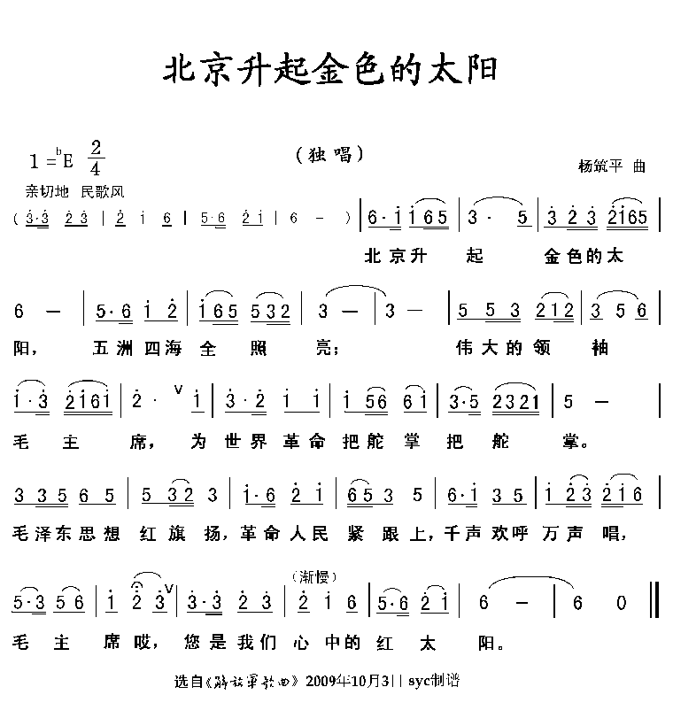 >> 北京升起金色的太阳-革命歌曲(简谱)