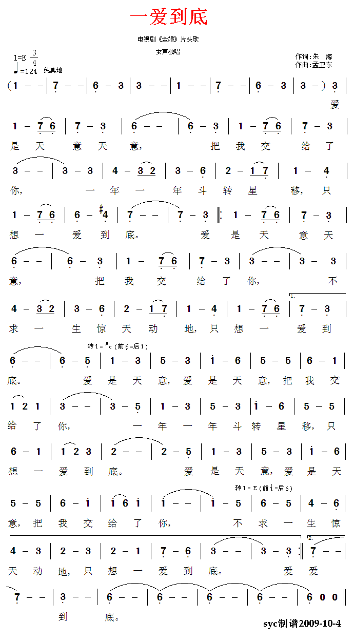 >> 一爱到底-谭晶(电视剧《金婚》片头曲_简谱)