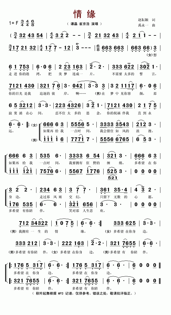情缘-谭晶 崔京浩(陈真后传片尾曲_简谱)