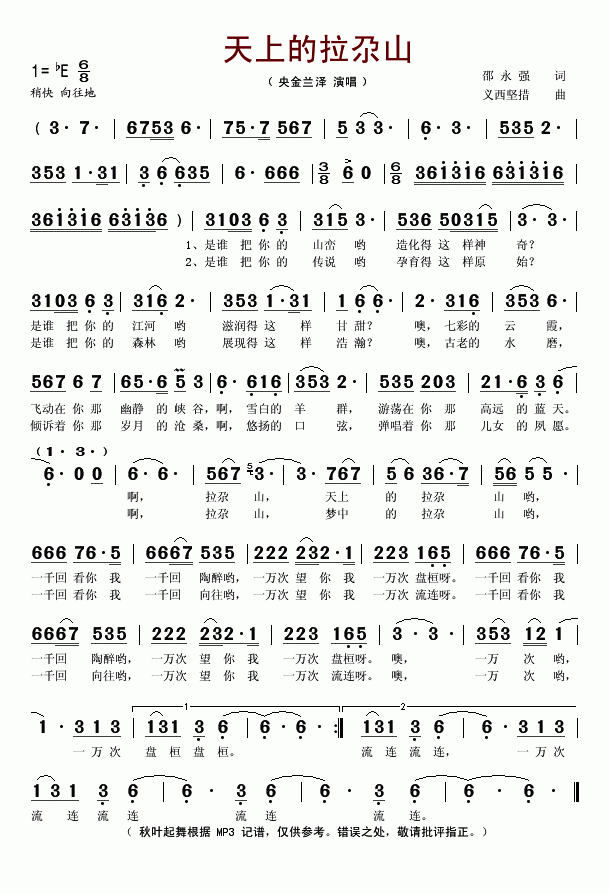 >> 天上的拉尕山-央金兰泽(简谱)
