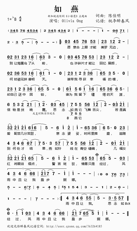 >> 如燕(连续剧《小娘惹》主题曲)——Olivia Ong(简谱)