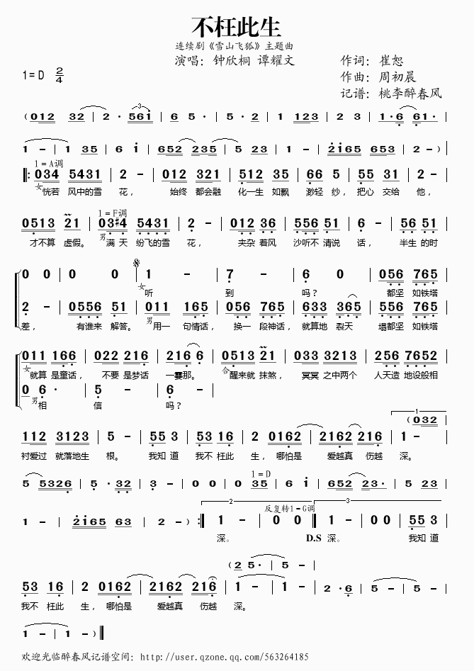 >> 不枉此生(《雪山飞狐》主题曲)——钟欣桐 谭耀文(简谱)