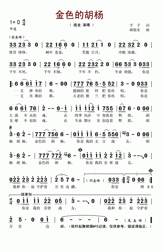>> 金色的胡杨-庞龙(简谱)
