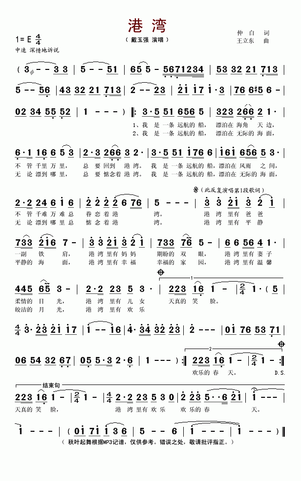 >> 港湾-戴玉强(简谱)