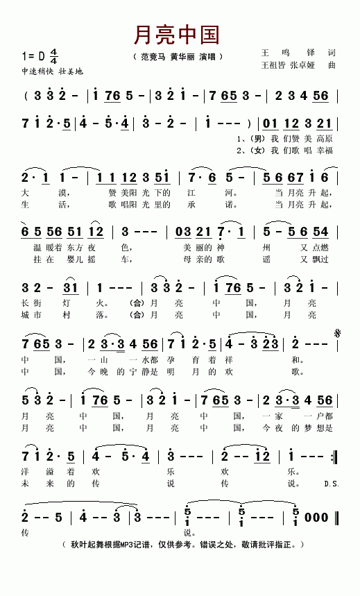 >> 月亮中国-范竞马 黄华丽(简谱)
