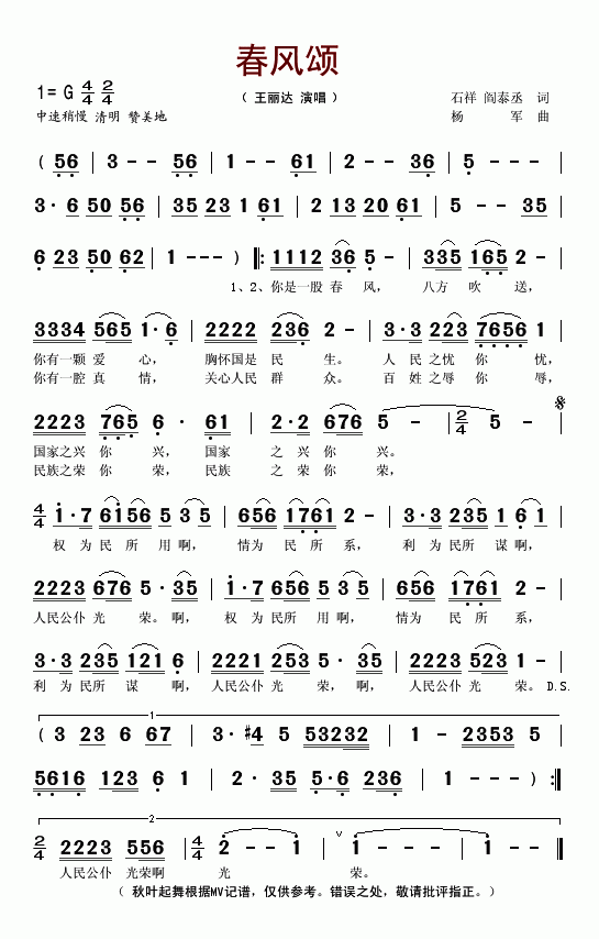 王丽达演唱的《春风颂》是一首反映改革开放30年来中国人民过上幸福和谐生活的歌曲,新谱二老师记谱。