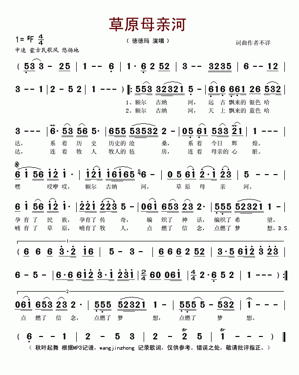>> 草原母亲河-德德玛(简谱)