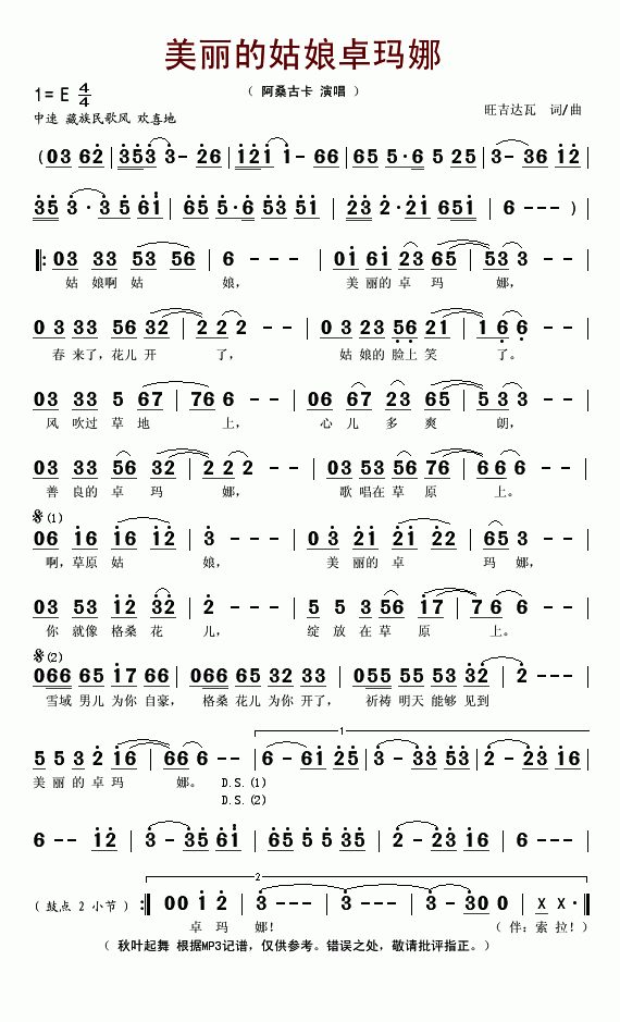 阿桑古卡 - 美丽的姑娘卓玛娜 歌词: