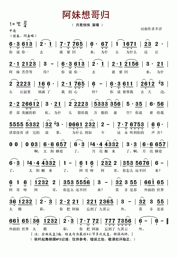 阿妹想哥归-月亮悄悄(网络歌曲_简谱)
