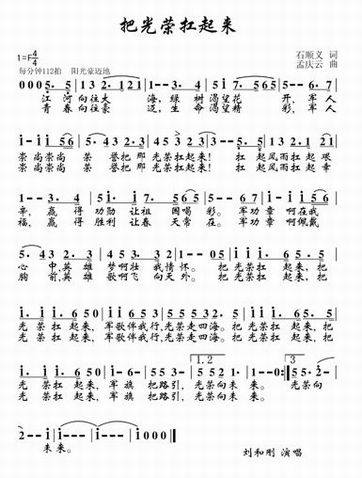 江河向往大海,绿树渴望花开,军人崇尚崇尚荣誉,把那光荣扛起来;扛起风雨扛起艰辛,赢得功勋让祖国喝彩,军功章啊在我心中,英雄梦啊壮我情怀!把光荣扛起来,把光荣扛起来,军歌伴我行,光荣走四海;把光荣扛起来,把光荣扛起来,军旗把路引,光荣向未来!