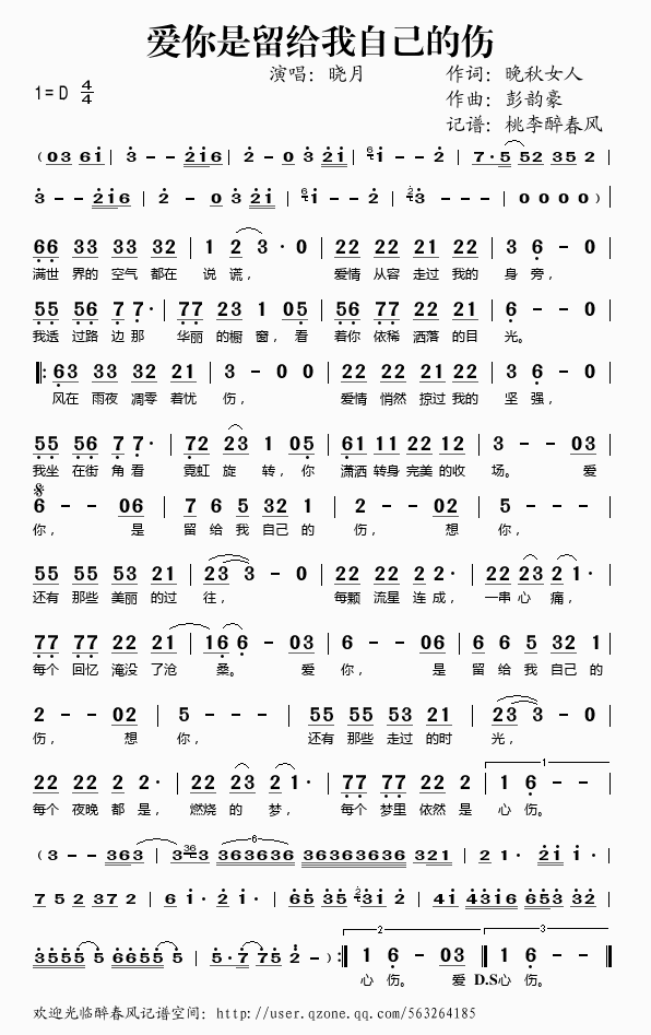 >> 爱你是留给我自己的伤——晓月(简谱)