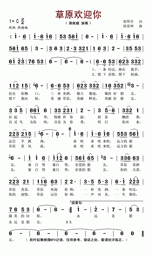简介:《草原欢迎你》的歌词创作得到了邰景坤老师的许多帮助和指导,蒙语“塞拜弩”能够走进《草原欢迎你》的歌词中来,就是邰老师的在歌词中的画龙点睛。老兵老歌很欣赏邰老师艺术风格,他对草原的风情有着自己的生活感受和对生活的凝练,通过《草原欢迎你》中欢快流动的旋律,不仅表达了草原人民热情、善良、好客和美丽的草原风情,也反映了人们对大草原的向往、关怀、支持和厚爱。在这辞旧迎新的欢快日子里,把《草原欢迎你》这首歌,送给喜欢草原歌声的朋友们,送给生活在草原上的人们,送给关爱草原、向往草原的朋友们。在这里,老兵老歌要特别感谢邰景坤老师和燕尾蝶朋友对老兵老歌的大力支持,是她们的倾情相助和大力支持,夙愿了老兵老歌眷恋草原、讴歌草原的又一曲梦想。