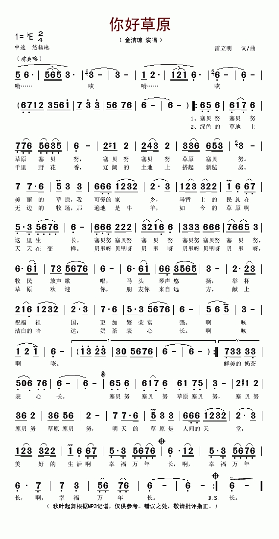 >> 你好草原-金洁琼(简谱)