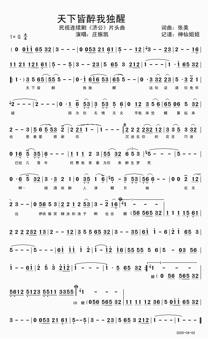 天下皆醉我独醒-庄振凯(简谱 歌谱 歌曲简谱 合唱简谱 民歌简谱 影视简谱)
